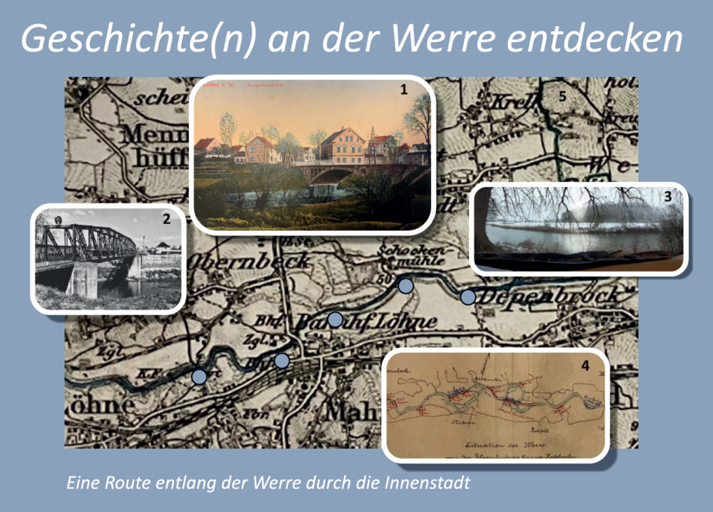 Geschichte(n) an der Werre entdecken Wo stand eigentlich die Fünf-Pfennigs-Brücke? Und was waren die beliebtesten Badestellen in der Werre? Wo lag die Gohfelder Burg und warum gibt es kein „Brüggenfest“ mehr? Antworten auf diese und weitere Fragen rund um die Löhner Werreufer erhalten Sie bei einem Spaziergang entlang der ,,Geschichte(n) an der Werre“. Wenn Sie die QR-Codes an den fünf gut sichtbaren Standorten entlang der Route scannen, können Sie sich die Geschichten auf Ihrem Smartphone anhören. Die ca. 2,5 km lange, barrierefreie Route führt Sie auf befestigten Wegen vom Parkplatz am Wehr an der Schützenstraße bis zur Fußgängerbrücke am Löhner Gymnasium. Die „Geschichte(n) an der Werre“ sind ein Gemeinschaftsprojekt der Geschichtswerkstat Löhne und der Stadtmarketing AG Vitale City.